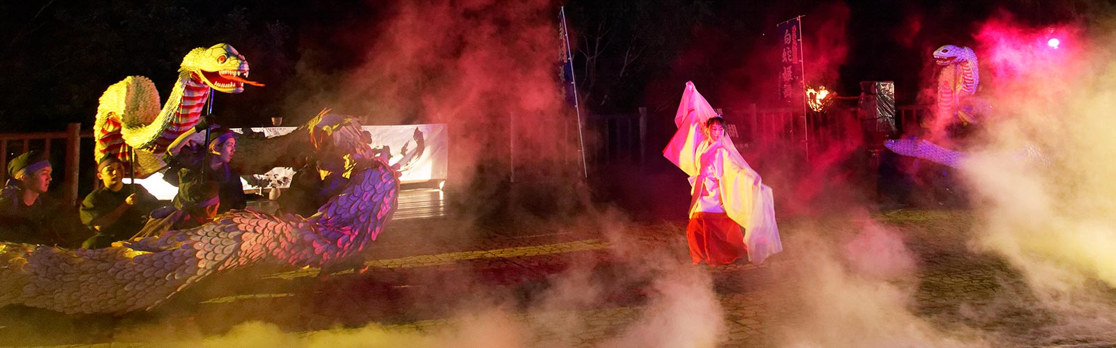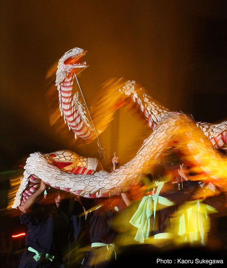 然別湖を守る女神・白蛇姫のアイヌ伝説を全長13mの親蛇、8mの子蛇と幻想的に舞い踊り五穀豊穣を願う「白蛇姫舞」。アイヌの人々による神々への儀式「カムイ・ノミ」や古式舞踊など伝統文化に触れながら、アイヌ民族と自然との深い関わり、北海道の大自然と共に生きる尊さと神秘、喜びを伝えます。