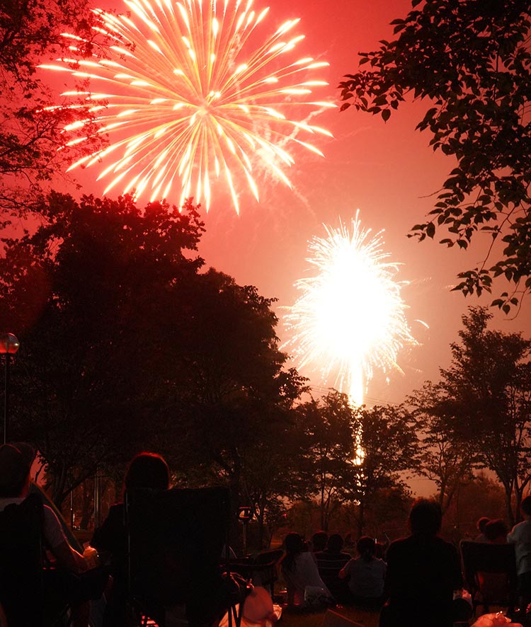 至近距離で打ち上がる4000発以上の花火を、広大な然別川河川敷で寝転びながら見上げるように観覧できる迫力の花火大会。「しかりべつ川公園」の味覚コーナーでは、ビールや焼き鳥なども販売。手を伸ばせば届きそうな花火のスペクタクル、鹿追町の夏のきらめきが夜空に輝きます。