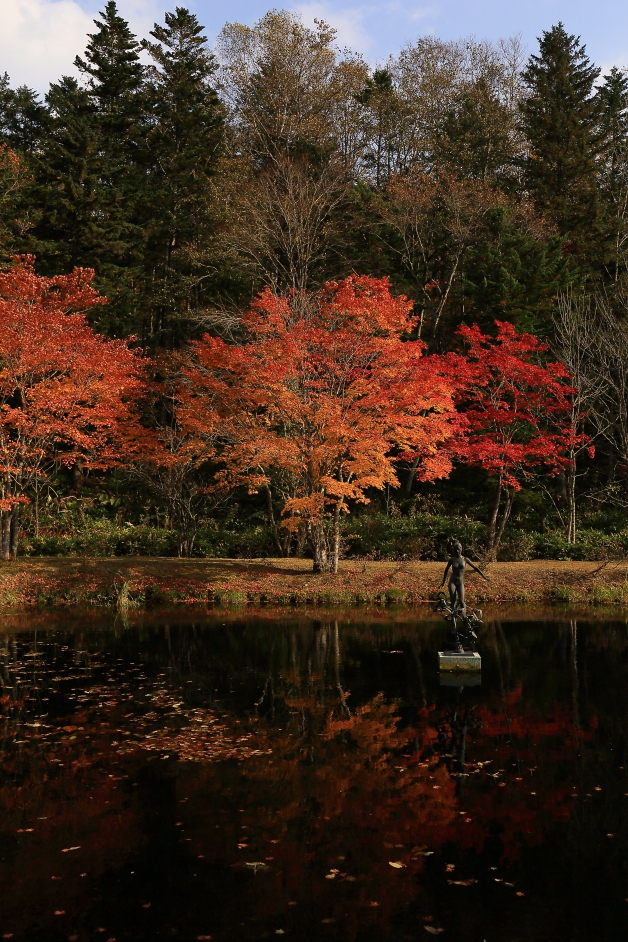 鹿追の秋の風景のど定番、福原山荘です。水面に映った紅葉もまた綺麗です。