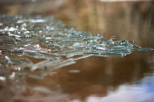 あちこちの水面に薄氷。落ち葉のミルフィーユ。しばれと風の織りなすアートですね。