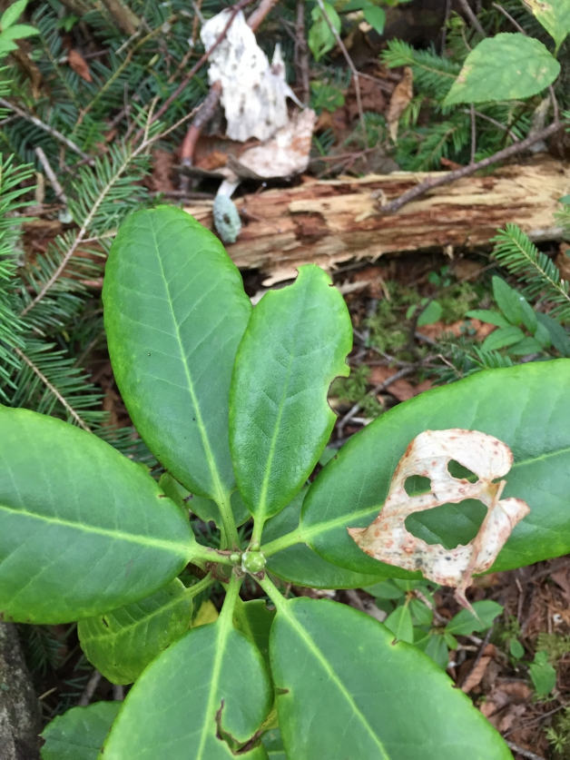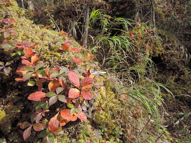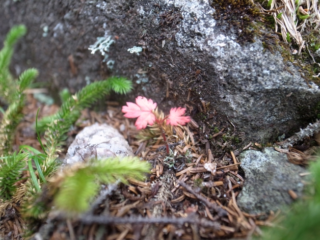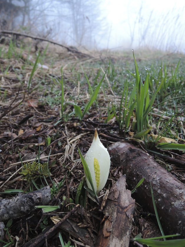 倒木をくぐろうとしてしゃがんだら、小さな、開いたばかりのミズバショウを見つけました。