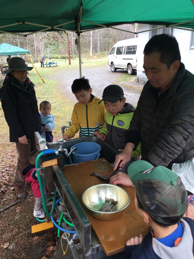 なかなか生きた魚をさばく場面に出会わない子ども達。興味津々。