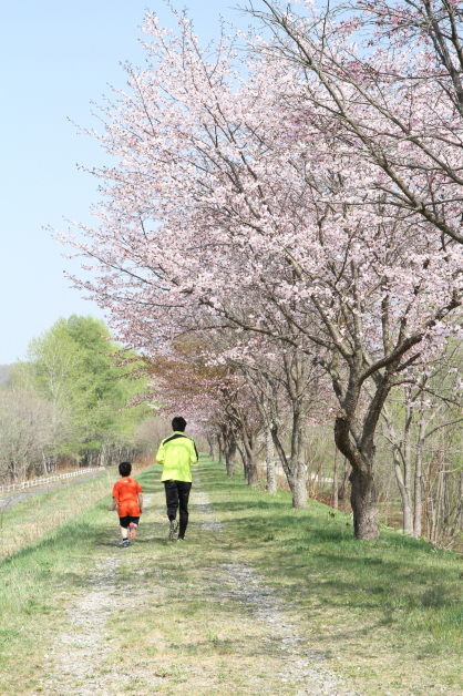 満開の桜並木の下を先生と一緒になんとか走り切りました。